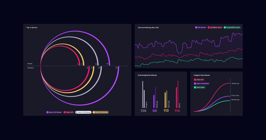 Special attention was paid to alarm and status handling – a central component of the Drücker Alarm Management System. Here, critical information must be reliably recognized, quickly recorded, and clearly interpreted. Clearly defined color codes, consistent visual hierarchies, and intuitive interaction patterns were used to create a user interface that both increases response speed and reduces the likelihood of errors. In addition to alarms, infographics also play a central role. They were designed to be visually dominant and functionally precise in order to make complex relationships comprehensible at a glance and to present the density of information in a clear manner.
