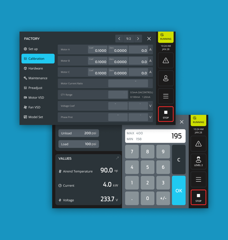 The new HMI for Kaishan USA is an interface solution for industrial compressed air systems. The aim was to simplify the operation of compressor systems and improve user-friendliness. Existing operating concepts were revised and combined in a clearly structured, intuitive user interface. The user interface offers clear visualizations, process-oriented navigation, and unambiguous warning communications—for reliable and safe use in industrial environments.