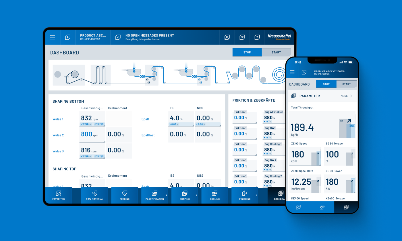 The KraussMaffei Group is a globally operating company whose portfolio includes all technologies of injection molding, extrusion, and reaction molding. For KraussMaffei Extrusion GmbH, the world's leading manufacturer of machines and systems for the extrusion and recycling of plastic and rubber products, a comprehensive and flexible concept and design were developed in an initial project. The goal was to simplify and harmonize the complex and heterogeneous forms of previously existing UIs.
