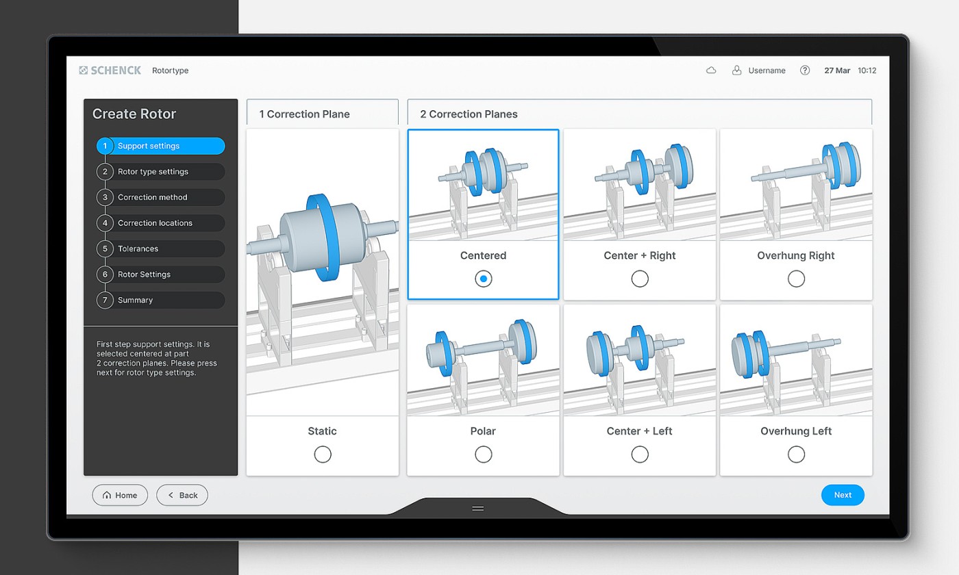 The harmonized user interface and operating philosophy at the machine and in the cloud results in a holistic user experience throughout the entire balancing process, regardless of the user location. From the central creation and management of rotor types (RotorManager), the highly accurate measurement and correction of unbalance (BalancingAssistant), the reliable documentation of the results (ReportCenter) or the maintenance of the machine (MaintenanceAssistant) - Schenck ONE offers a wide range of possibilities for intuitive support along the balancing process in the browser and on the machine.
