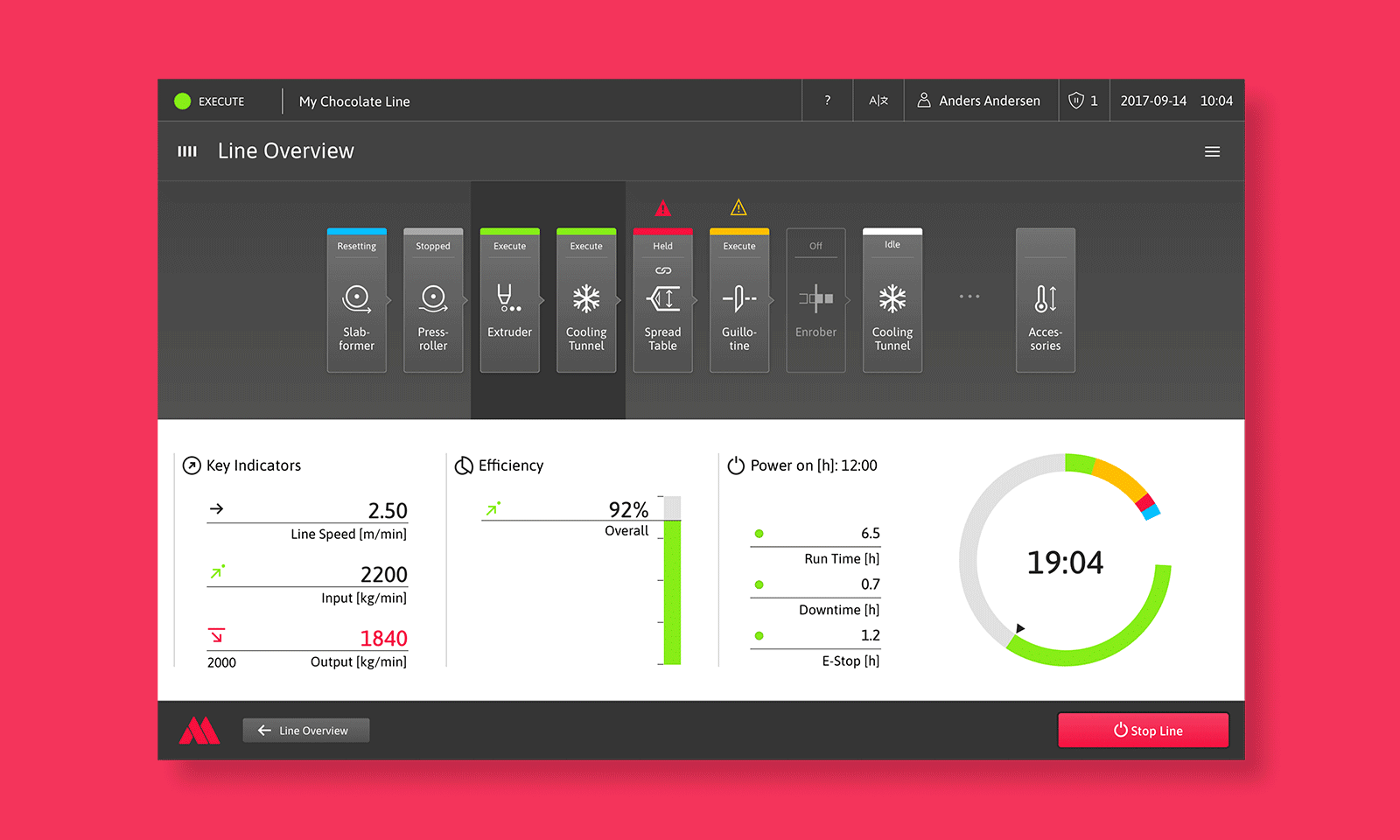Aasted ApS ist ein weltweit marktführender Hersteller von Produktionslösungen für die Schokoladen-, Bäckerei- und Süßwarenindustrie. Ihr Portfolio umfasst eine Vielzahl von Maschinen zum Temperieren, Extrudieren, Aufgießen, Überziehen, Backen und Kühlen – alleinstehend oder im Verbund als komplette Verarbeitungslinie. Die Herausforderung bestand darin, diese Vielfalt an Anwendungen in einem übergreifenden Bedienkonzept und Screendesign zu bündeln und zu vereinheitlichen.
