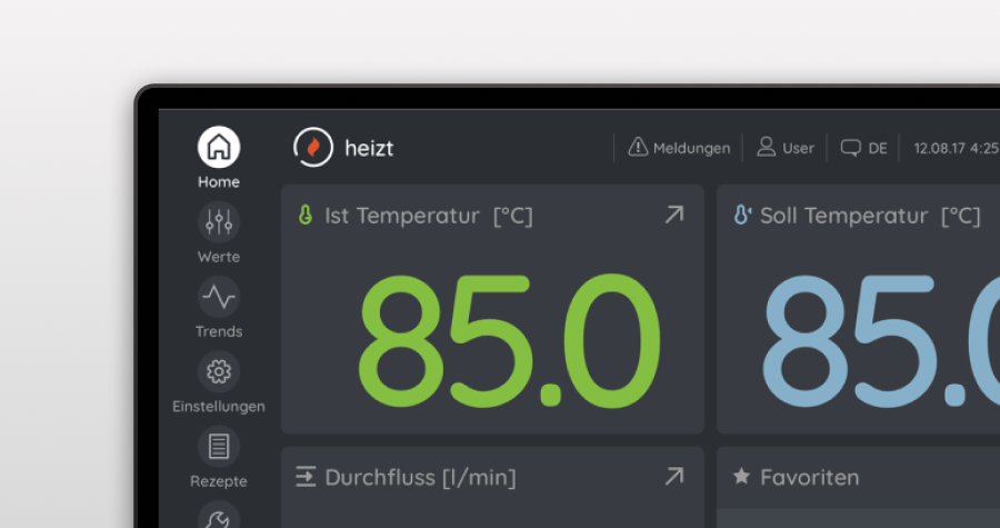 Das Projekt wurde mit Web-Technologie entwickelt, um eine einheitliche Darstellung auf allen Ausgabegeräten zu gewährleisten. Das Interface passt sich responsiv auf die Monitorgröße des Endgerätes an. Die Informationseinheiten reagieren in Anzahl und Form adaptiv auf den zur Verfügung stehenden Platz. Resultat ist immer eine optimale Abbildung der Kennzahlen und Funktionen. Das Layout ist modular aufgebaut und von kompakten Geräten bis hin zur Anlagenbedienung skalierbar.