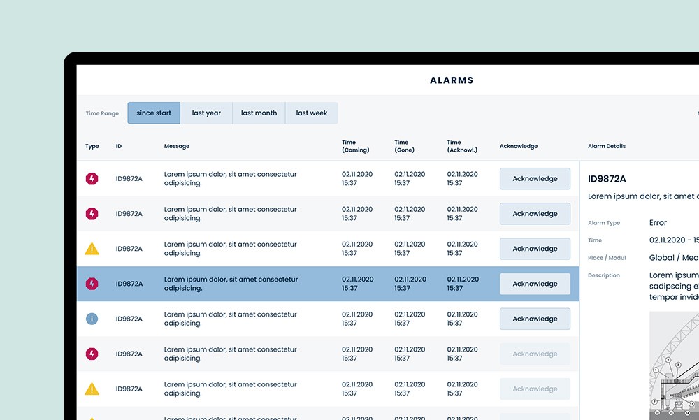 Das grafische Design ist aus dem Corporate Design des Herstellers und der zugehörigen Konzerngruppe abgeleitet und bietet mit zurückhaltender Farbigkeit eine ideale Plattform für Warnungen und Fehlermeldungen. Diese können somit in Signalfarben die Aufmerksamkeit der Servicetechniker:innen auf sich ziehen und schnell und zuverlässig auf Probleme hinweisen. Ausfallzeiten können folglich durch präventive Wartung vermieden werden.