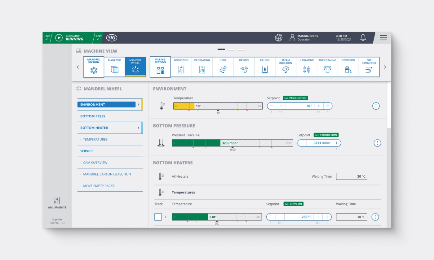 Mit dem SIG CRUISER wurde eine einheitliche Lösung zur optimalen Bedienung verschiedener Maschinen innerhalb einer Produktionslinie geschaffen. Dabei steht immer das Produkt im Fokus – der Getränkekarton – der hier als stilisierte Grafik zur einfachen Navigation zwischen den Produktionsbereichen dient. Dabei werden dem User stets nur nutzerrollenzentrierte und kontextabhängige Informationen und Einstellmöglichkeiten präsentiert, um stets eine verständliche Bedienung und hohe Usability zu gewährleisten.